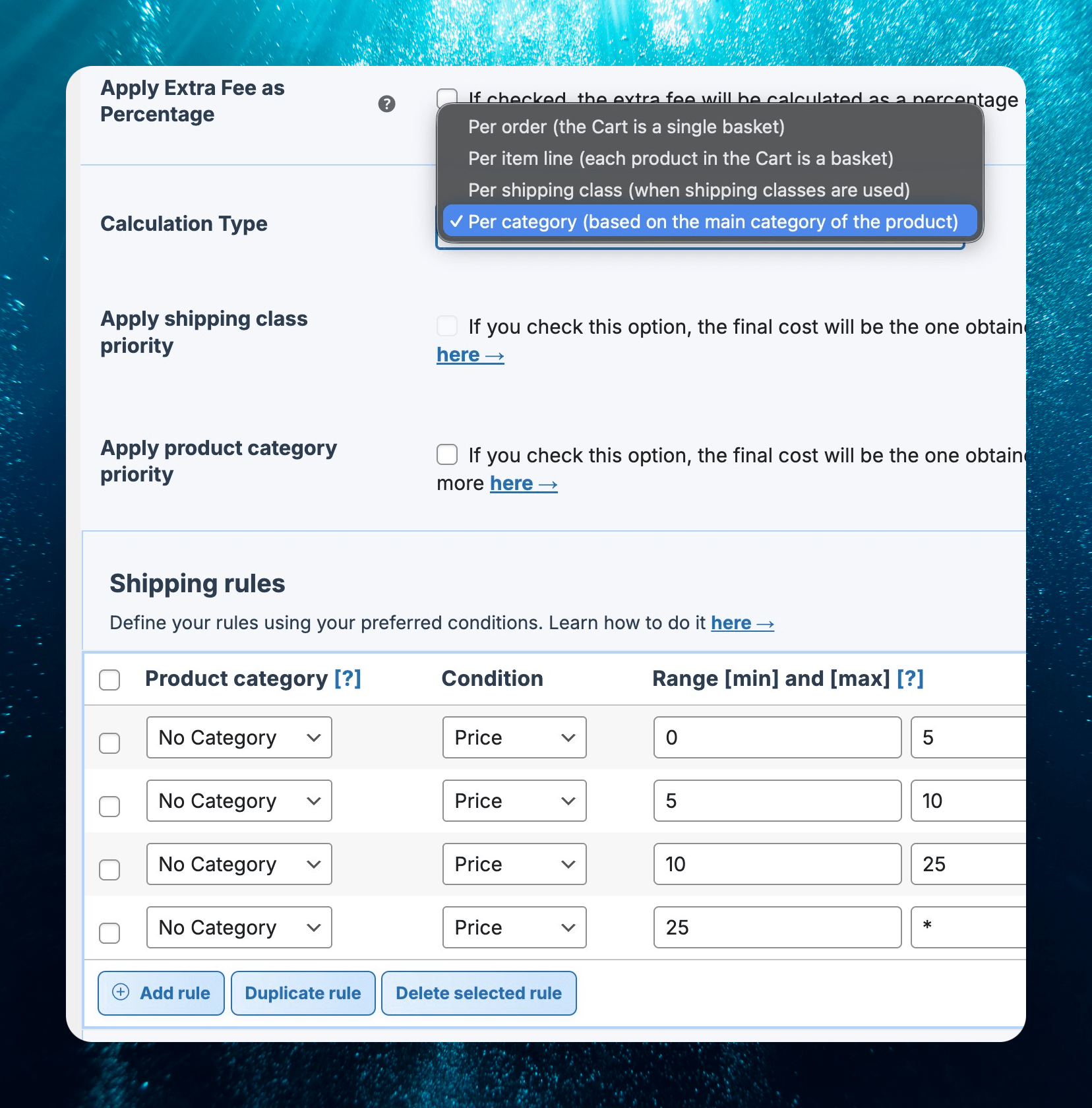 With shipping calculation by category, you’ll be able to apply different costs to products depending on the category they belong to, using the weight, price, or unit conditions you define.