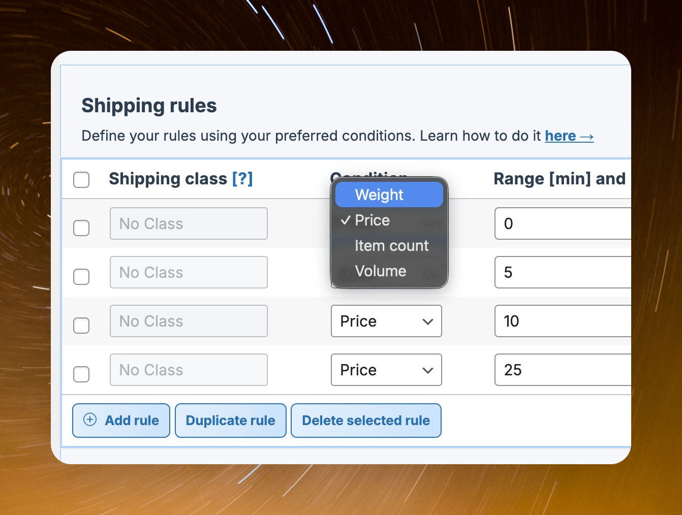 You don’t need to create mathematical formulas to configure advanced shipping rates properly. We don’t make life difficult for you: choose the conditions under which the price will apply, set the ranges in which you need to offer different costs, and that’s it!