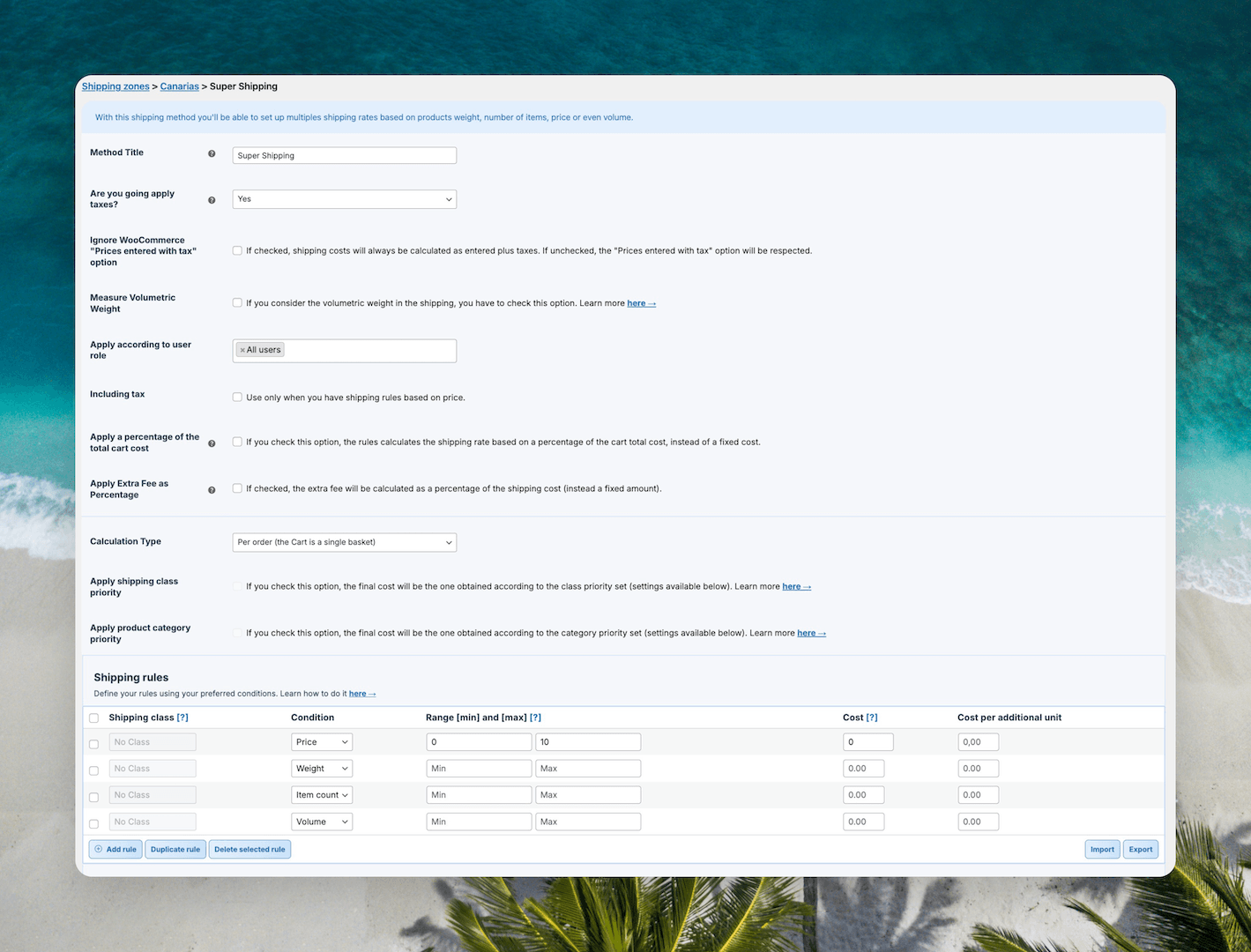 Super Shipping for WooCommerce is a table rate shipping plugin for your online store that allows you to create advanced shipping rules. Do you need to ship your products based on weight or volume? Do you need to set different prices based on the number of products being shipped? Does the shipping price change according to the total Cart price? Super Shipping is here to solve it.